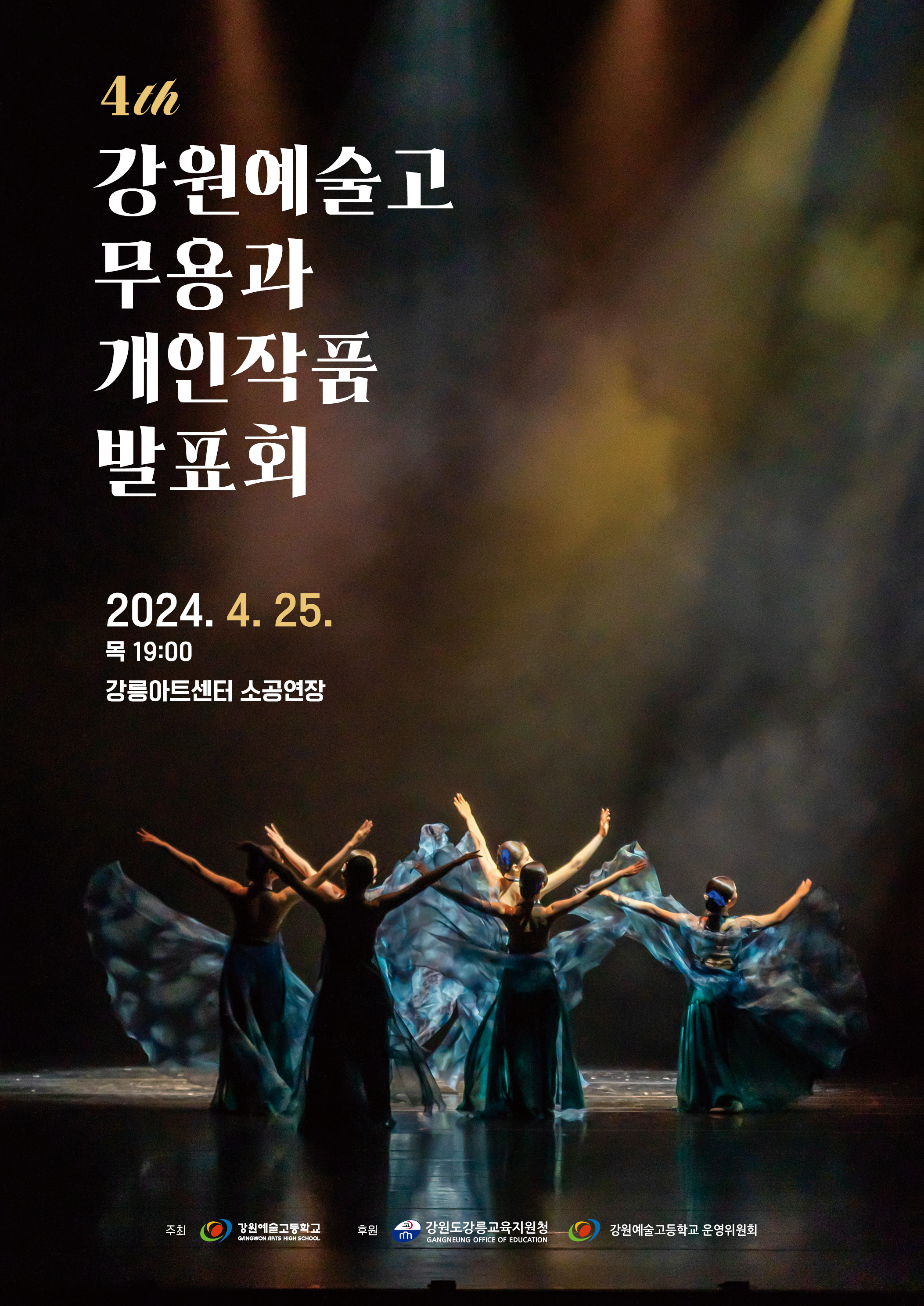 【강원타임즈】김장회 기자 = 강원특별자치도교육청 강원예술고등학교(교장 장국철)는 2024년 4월 25일(목) 오후 7시 강릉아트센터 소공연장에서 제4회 강원예술고등학교 무용과 개인작품 발표회를 개최한다.