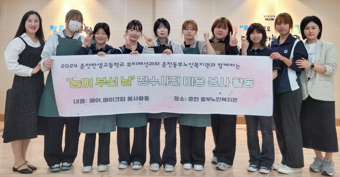 【강원타임즈】김장회 기자 = 강원특별자치도교육청 춘천한샘고등학교(교장 한세훈) 뷰티패션과는 2024년 4월 16일부터 19일까지 춘천 동부노인복지관에서 개최한 ‘눈이 부신 날’ 행사에 참여해 어르신들의 메이크업과 헤어 미용을 도와 영정 사진 촬영 지원에 나섰다.