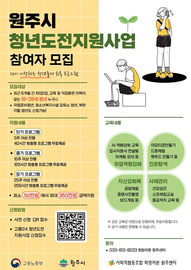 참여 신청은 고용노동부 고용 24, 온통 청년, 원주시청 홈페이지 등에 게시된 안내문의 큐알(QR) 코드를 통해 접수한다.